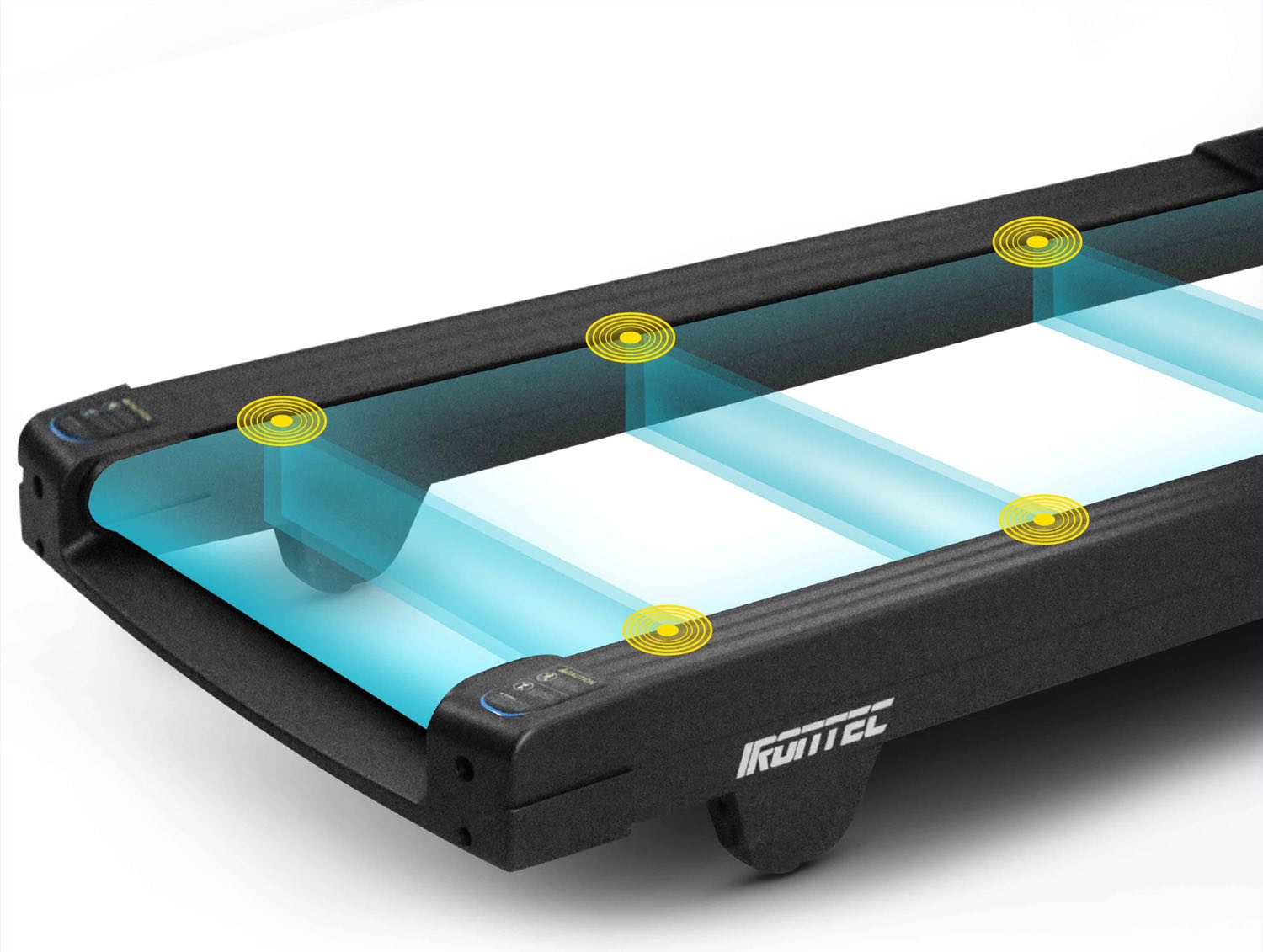 มาตัวซับแรงกระแทกมากถึง 8 จุด (ซ่อนไว้อยู่ใต้กระดานวิ่ง เพื่อความสวยงาม) ลู่วิ่งไฟฟ้า ตัวนี้ให้ความรู้สึกที่นุ่ม วิ่งสบาย